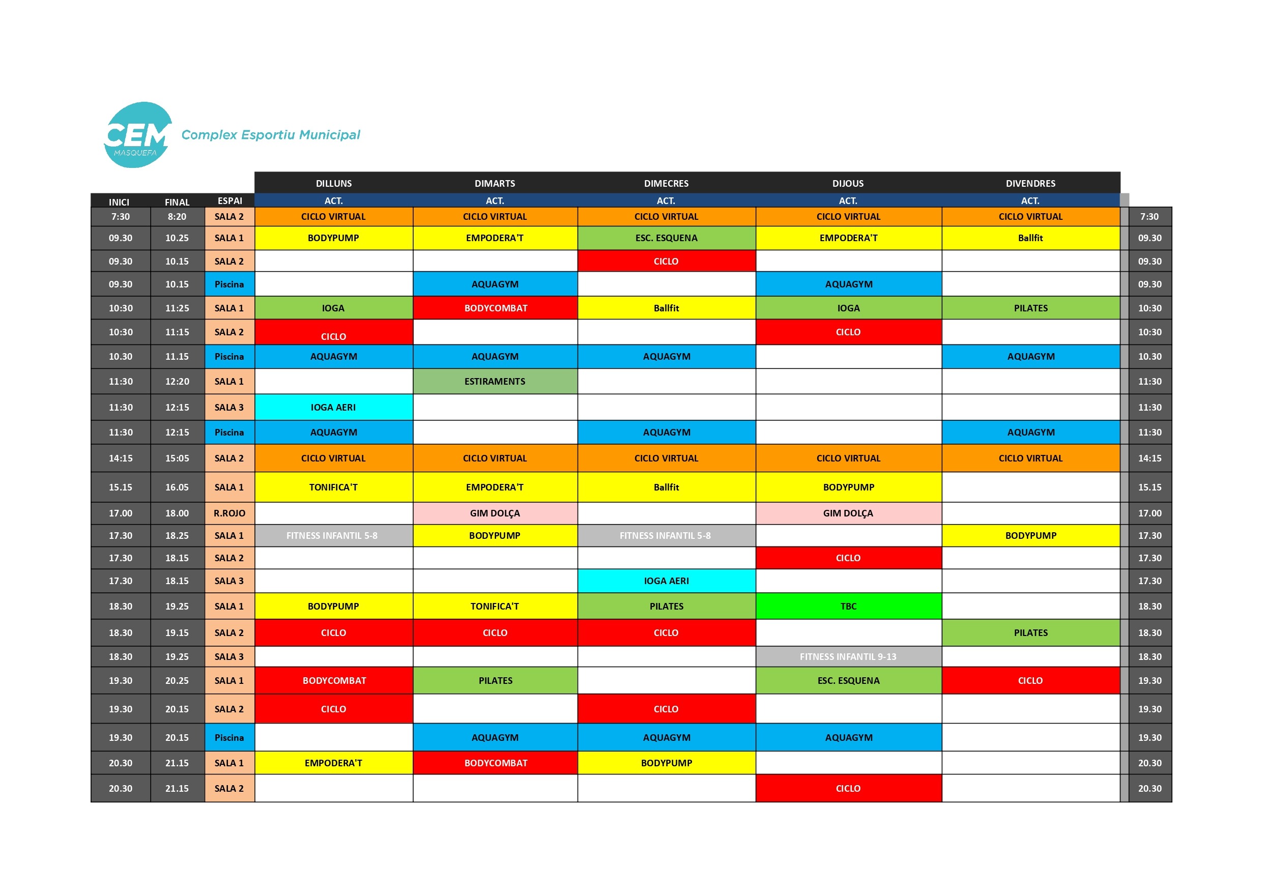 La direcció es reserva el dret a modificar les activitats d’aquest horari, així com els tècnics que les imparteixen.